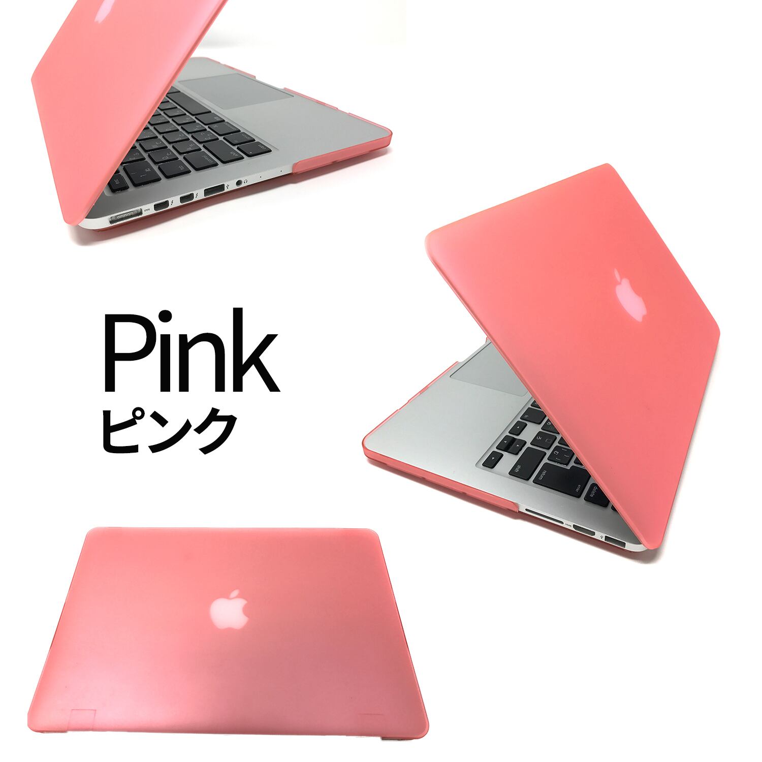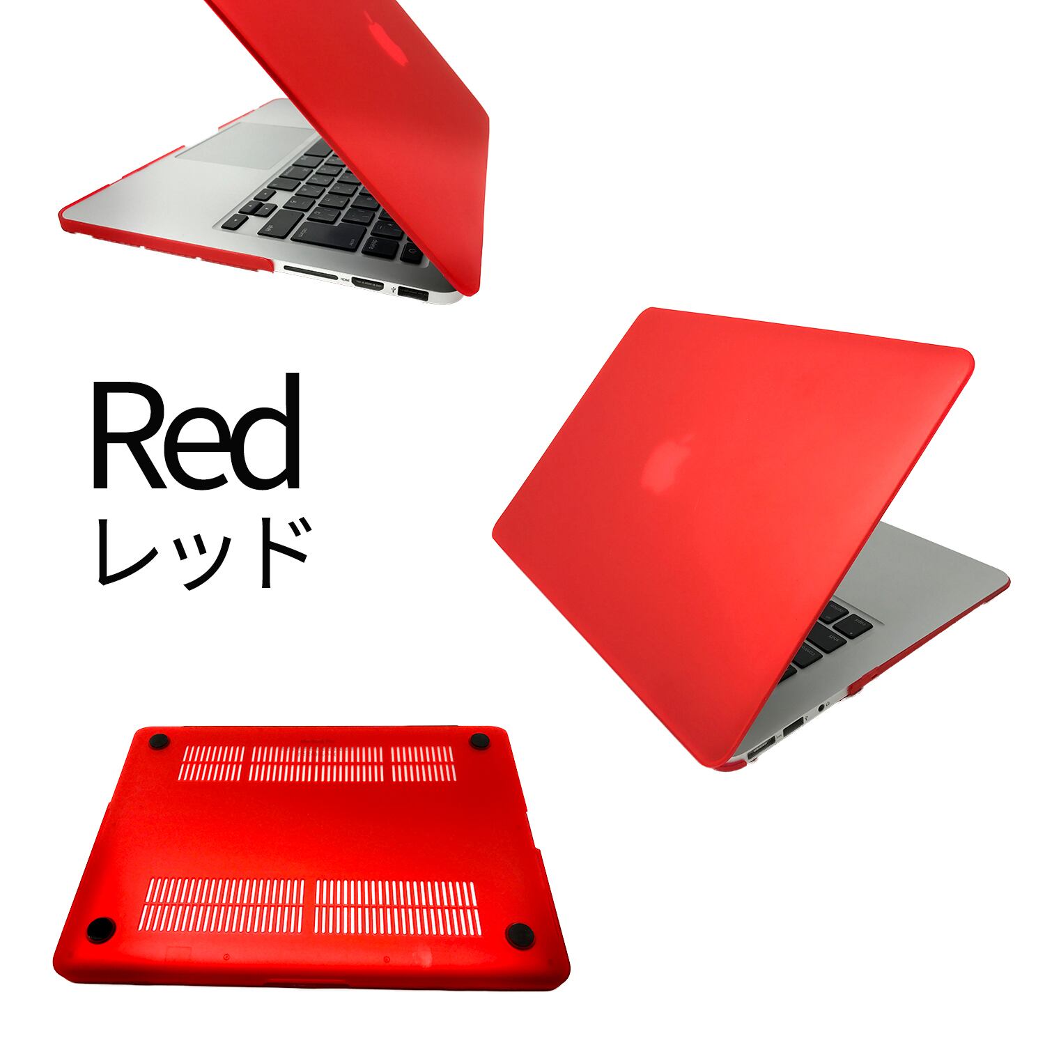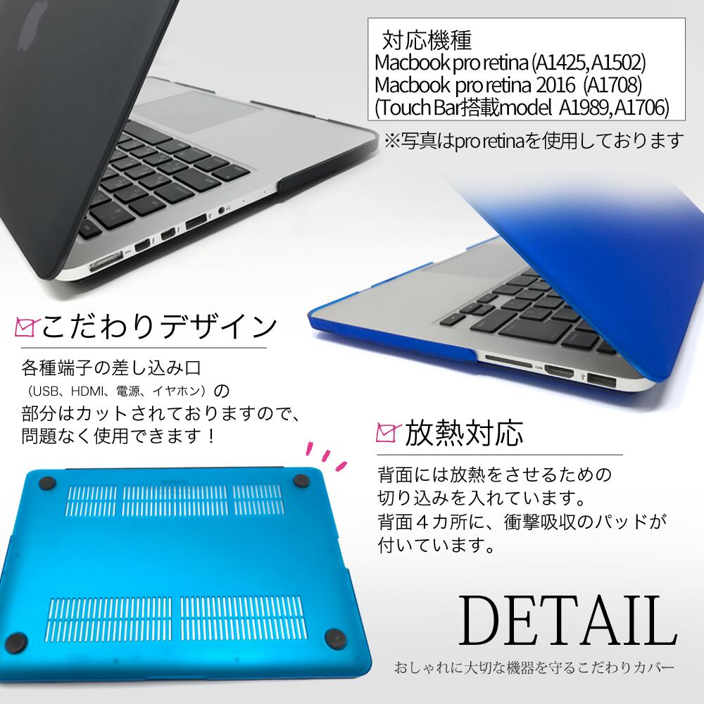 本製品はポリカーボネート製の素材で作られており、とても耐久性に優れています。また、装着時にもMacBookのフォルムを損なわない形、背面のアップルマークもうっすら透けて見えます!(カラーによっては見にくくなります。)各種端子の差し込み口(USB、HDMI、電源、イヤホン)の部分はカットされておりますので、問題なく使用できます。※画像は別のモデルの場合がございますが、各サイズ取り揃えておりますのでご安心下さい。