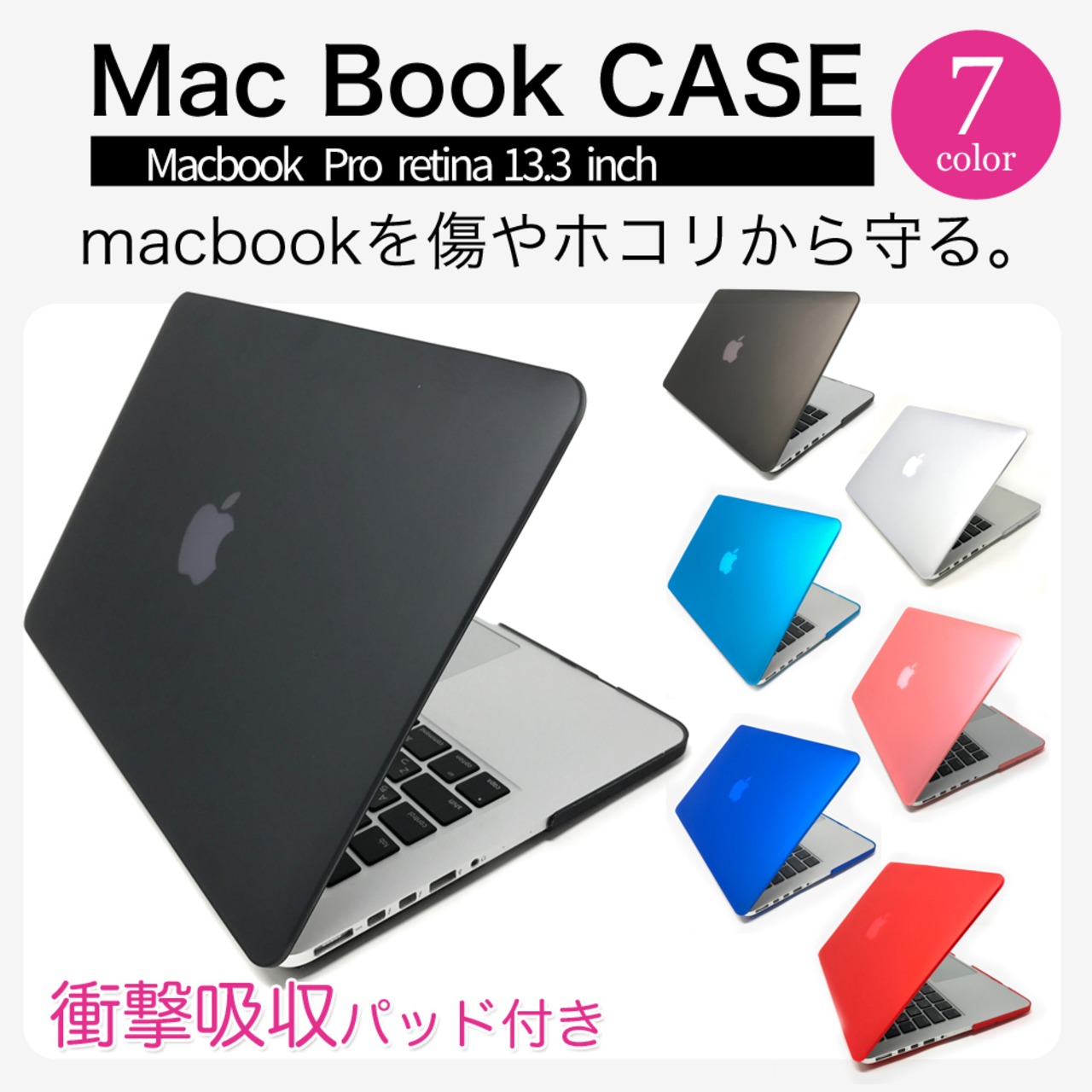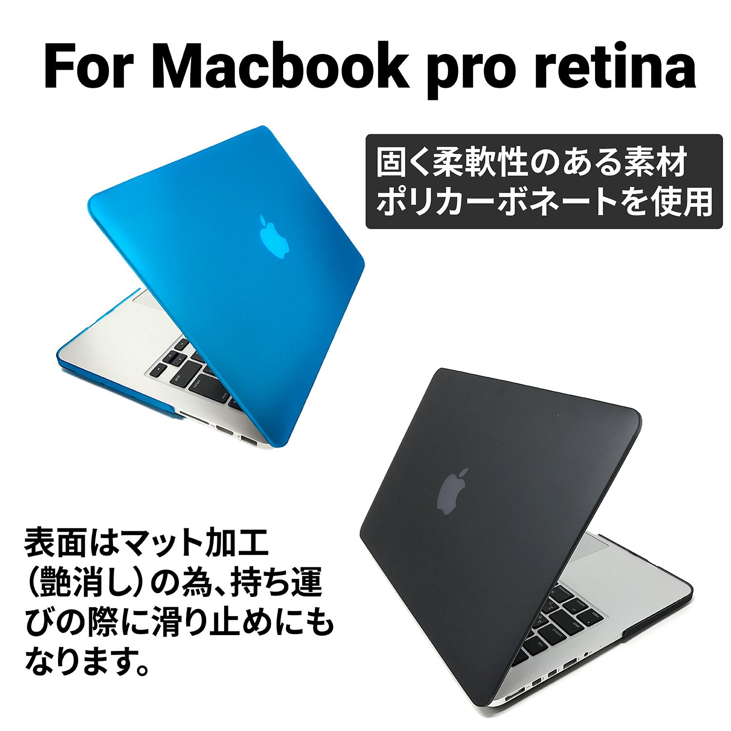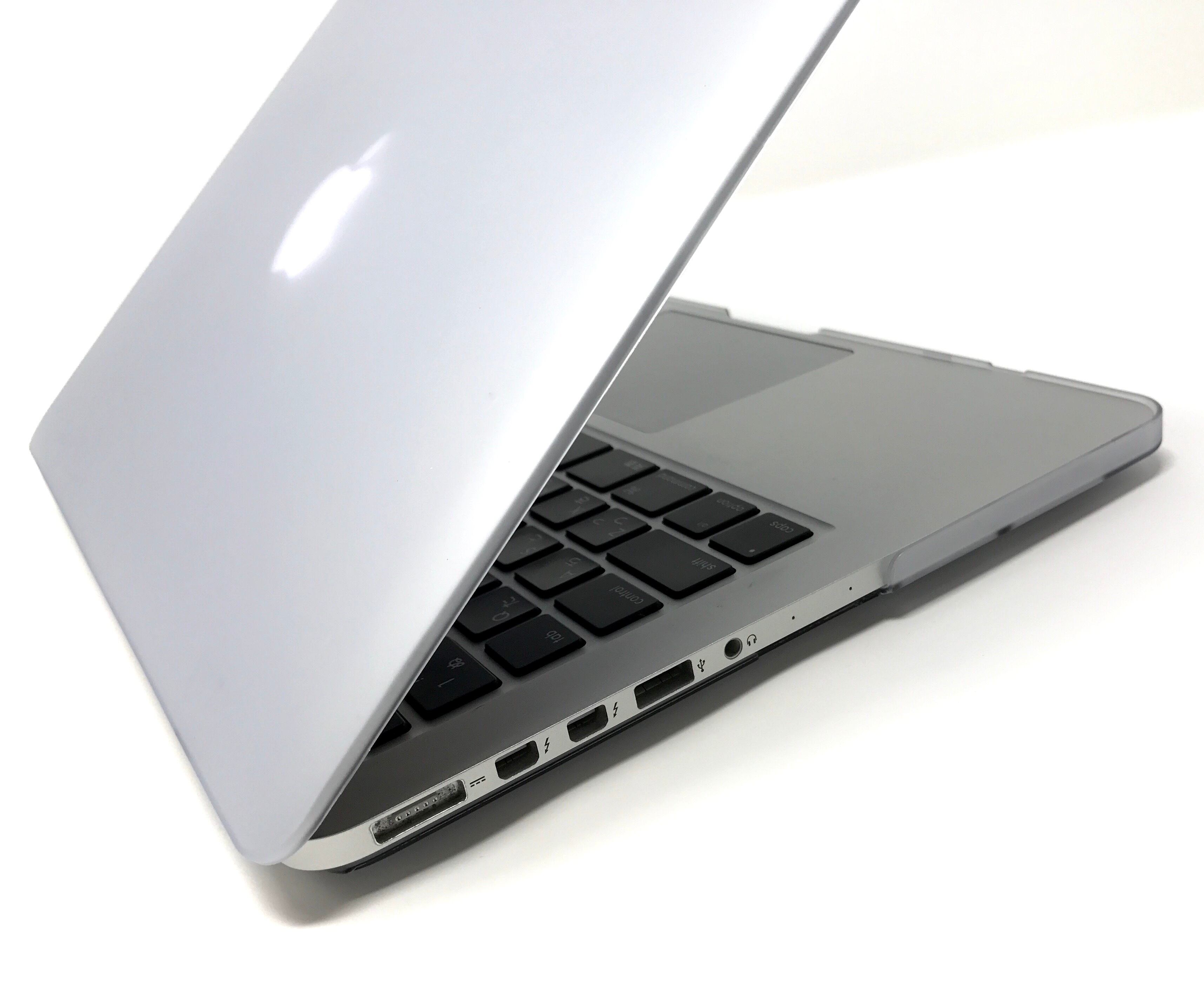 本製品はポリカーボネート製の素材で作られており、とても耐久性に優れています。また、装着時にもMacBookのフォルムを損なわない形、背面のアップルマークもうっすら透けて見えます!(カラーによっては見にくくなります。)各種端子の差し込み口(USB、HDMI、電源、イヤホン)の部分はカットされておりますので、問題なく使用できます。※画像は別のモデルの場合がございますが、各サイズ取り揃えておりますのでご安心下さい。